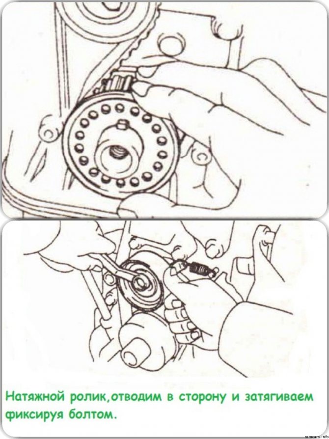 Ослабляем центрирующий болт даём натяжку роликом,насколько позволит нам пружина. Проворачиваем весь механизм ГРМ,проверяем натяжку ремня,если недостаточно существует прослабление,ослабляем центрирующий болт натяжителя потом монтировкой регулируем нужный натяг ремня.