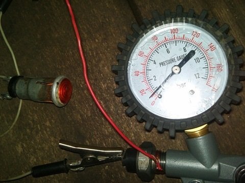 - Датчик сработал — нужно уменьшить подачу воздуха в шланг и дождаться, пока он опять замкнёт цепь. В этот момент важно зафиксировать величину давления. Если она близка к 0,4 кгс/см2 – с датчиком все в порядке.