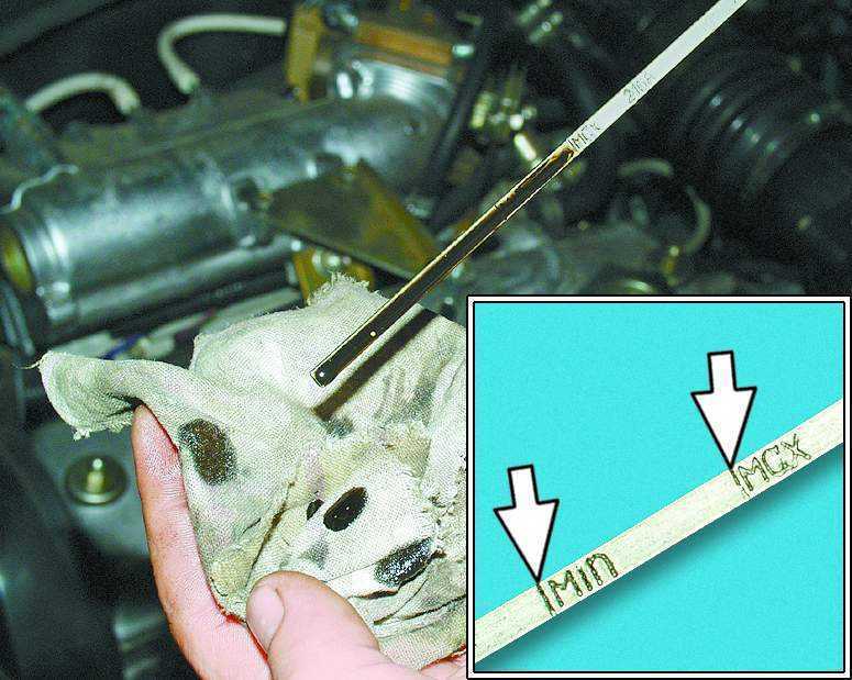 - Проверяем уровень смазки по щупу, доливаем по необходимости, если уровень в порядке, переходим к следующему пункту