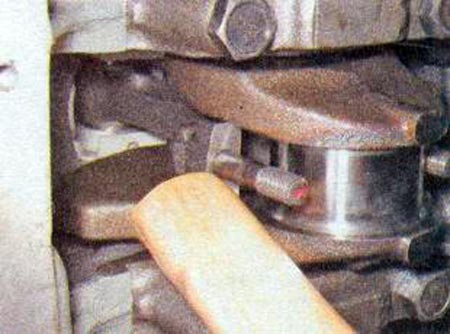 Отворачиваем болты остальных крышек коренных подшипников, удерживая коленчатый вал от падения. Снимаем поочередно крышки и вынимаем коленвал из картера двигателя. Все вкладыши крышек (кроме третьей), установленные в постелях коренных подшипников, имеют проточку. На крышках коренных подшипников выполнены метки, соответствующие их порядковому номеру (отсчет от носка коленчатого вала), обращенные к левой стороне блока цилиндров. На пятой крышке выполнены две метки, разнесенные по краям.