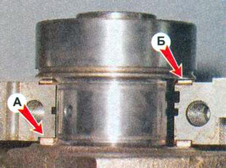 Отвернув два болта, снимаем крышку заднего коренного подшипника. В проточках задней опоры коленчатого вала установлены два упорных полукольца. Переднее кольцо А — сталеалюминевое, а заднее Б — металлокерамическое. Кольца можно вынуть, нажав на их торцы тонкой отверткой.