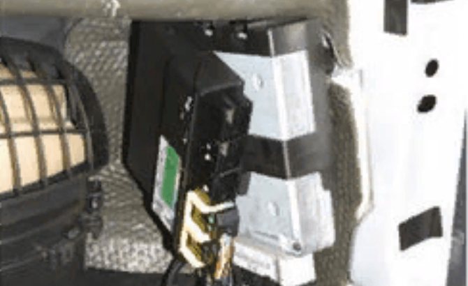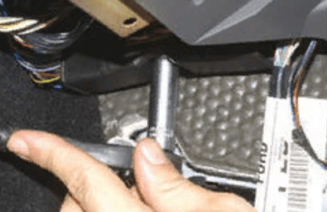 - Для снятия блока управления выключаем зажигание и отсоединяем клемму «минусового» провода от аккумуляторной батареи. Снимаем обивку правой боковой панели и, для удобства работы, вещевой ящик