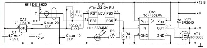 Устройство работает от бортсети автомобиля при напряжении в ней 10… 18 В и может управлять вентилятором с максимальным потребляемым током до 20 А или до 30 А при условии увеличения площади теплоотвода силовых элементов. Собственное потребление тока устройством не превышает нескольких миллиампер. Значения температуры включения вентилятора с минимальной частотой вращения и температуры, при которой частота вращения вентилятора достигает максимума, задают с дискретностью 0,1 °С при программировании микроконтроллера.