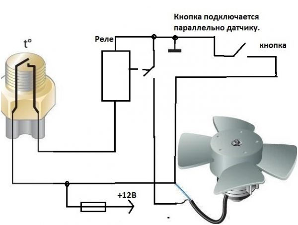 Самый простой способ заставить вентилятор включаться по желанию водителя — это вывести два провода от контактов датчика температуры в салон и подсоединить их к обычной кнопке на два положения. Для реализации этой идеи понадобятся только провода, кнопка и изолента или термоусадочная изоляция.