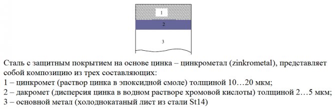• | Цинкрометалл — Приемлимый тип. Металл с эластичным покрытием на цинковой основе, слабые антикоррозионные свойства, устойчивость к механическим воздействиям. |