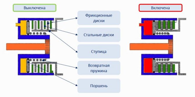 Также в конструкцию муфты входят поршень и возвратная пружина. Под действием давления жидкости поршень давит на пакет дисков, за счет чего и возникает сила трения между ними, а также передается крутящий момент. После того, как давление сбрасывается, пружина возвращает поршень обратно, и муфта выключается.