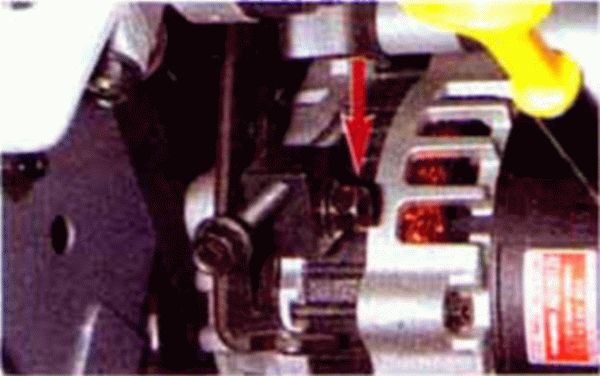 Снимаем масляный фильтр (см. «Замена масла в двигателе и масляного фильтра», с. 31). Отворачиваем гайку болта нижнего крепления генератора на несколько оборотов.