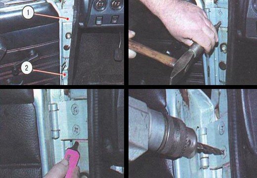 После снятия двери оставшиеся части винтов легко откручиваются пассатижами.