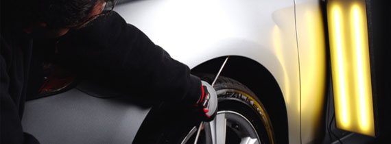 - Квалифицированные мастера используют для обнаружения вмятин и визуального контроля над ходом выправления особые лампы. Отражение света ламп дает возможность точно определять границы поврежденного участка.