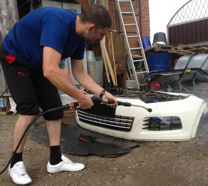 Старая краска с поверхности бампера удаляется с помощью смывки. Делается это следующим образом: