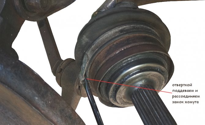 - как только ШРУС поставлен, монтируйте пыльник. Сначала клещами зажмите хомут на валу. Выровняйте давление в детали – при помощи отвертки зацепите кромку пыльника и отверните ее. Теперь зажмите хомут снаружи. Заглушка из пластика ставится в конце вала.