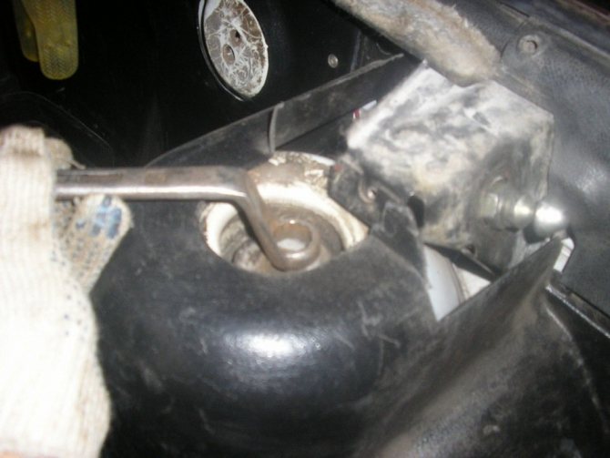 Снимаем резиновую заглушку опорной чашки в багажнике автомобиля и отворачиваем гайку изогнутым накидным ключом на «17», удерживая шток от проворачивания рожковым ключом на «8».
