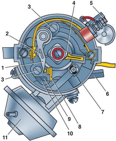 1 – рычажок прерывателя; 2 – текстолитовая подушка рычажка прерывателя; 3 – винт крепления контактной стойки; 4 – кулачок прерывателя; 5 – вывод провода низкого напряжения; 6 – гайка крепления хвостовика распределителя;7 – корпус распределителя; 8 – контактная стойка; 9 – паз для регулировки зазора между контактами; 10 – подвижная пластина прерывателя; 11 – вакуумный корректор |