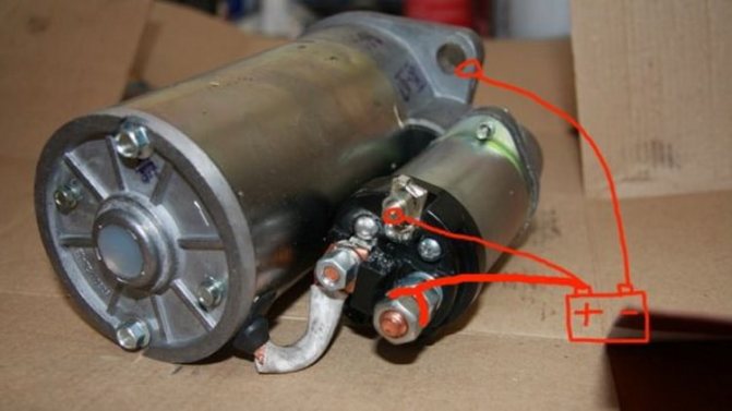 Соединяем проводами для «прикуривания» минусовую клемму, снятую с аккумуляторной батареи с корпусом стартера, второй провод соединяем одним концом с плюсовой клеммой аккумулятора, а вторым — с выводом управляющего провода тягового реле (втягивающего). Если тяговое реле исправно, то раздастся щелчок и выдвинется муфта привода, если нет — то втягивающего реле нужном менять.