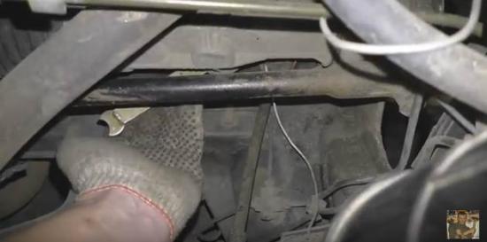 Берёмся за тягу рукой и с силой начинаем её шатать. Характерный стук сразу даст знать о наличии люфта. Гайка упора находится на рейке за левой тягой снизу, её надо нащупать пальцем. Теперь задача — попасть в гайку ключом и затем провернуть против часовой стрелки. Проверяем на люфт и, если надо, подтягиваем ещё.