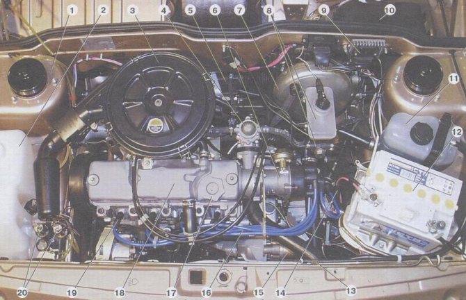 1 – передний стакан амортизационной стойки; 2 – резервуар для воды; 3 – фильтр воздуха; 4 – бензонасос; 5 – рулевая рейка; 6 – датчик распредвала; 7 – вакуумное устройство усиления тормозов; 8 – главный цилиндр тормозной системы и бочок к нему; 9 – коммутатор; 10 – предохранители; 11 – бачок системы охлаждения двигателя; 12 – аккумулятор; 13 – крепление капота; 14 – катушка зажигания; 15 – стартер; 16 – высоковольтные провода; 17 – горловина для масла; 18 – двигатель; 19 – свечи; 20 – система омывателя лобового стекла.