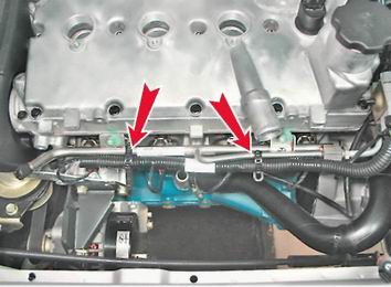 отворачиваем два болта крепления топливной рампы к головке блока цилиндров.