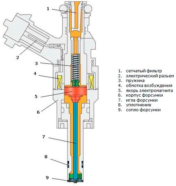 В бензиновых двигателях наподобие Лада Приора обычно используется электромагнитная форсунка. Она представляет собой простое устройство, которое работает при помощи электронного блока управления — в нужный момент он обязан обеспечить подачу напряжения на обмотку возбуждения клапана. Таким образом, создастся электромагнитное поле: оно втянет клапан с иглой и освободит сопло.