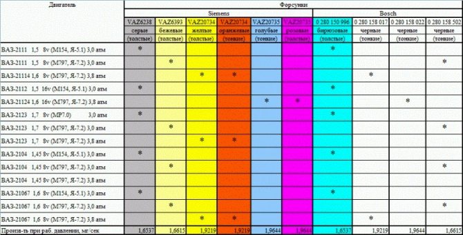 С форсунками Сименс никакой определённости нет, поскольку завод может устанавливать на один и тот же двигатель форсунки разных маркировок. Тем не менее есть чёткое различие между форсунками для восьмиклапанных и для 16-клапанных двигателей.