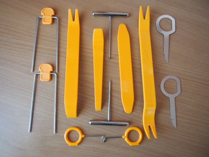 - желательно иметь специальный набор для снятия обшивки, если их нет, то можно воспользоваться плоской отверткой или чем-нибудь подобным;