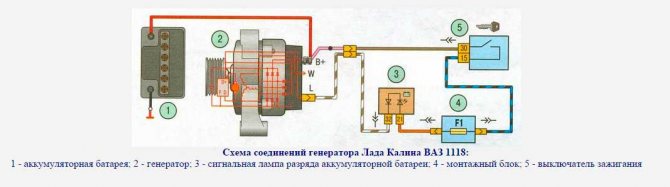 Схема подключения генератора довольно проста. Когда в автомобиле включается зажигание, напряжение подводится на регулятор напряжения через сигнальную лампу разряда аккумулятора. Когда двигатель запущен, обмотка возбуждения получает питание от 3 диодов, которые установлены на выпрямительном блоке.