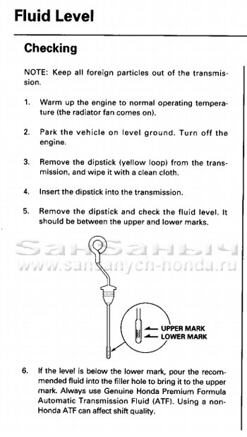 Теперь читаем инструкцию про проверке уровня ATF в АКПП (в начале там напоминание о том, что коробку нужно очистить от мусора): 1. Прогрейте двигатель до нормальной рабочей температуры (должен включиться электровентилятор системы охлаждения). 2. Поставте автомобиль на ровную поверхность и выключите двигатель. 3. Выньте щуп (желтая петля) (А) из корпуса трансмиссии, и вытрите его чистой тряпкой. 4. Вставьте измерительный щуп обратно в отверстие корпуса трансмиссии. 5. Выньте щуп и проверьте уровень рабочей жидкости. Трансмиссия должна быть заполнена рабочей жидкостью между низом и верхом метки щупа. 6. Если уровень ближе к нижней границе метки, долейте рекомендуемую жидкость до верхней границы через заливное отверстие. Всегда используйте оригинальную жидкость Honda ATF. При использовании другой жидкости возможны некачественные переключения.