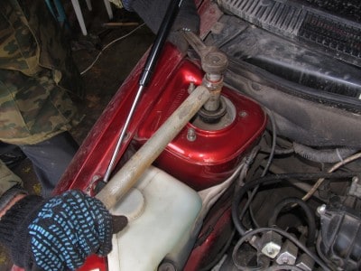 Далее откручиваем гайку крепления рулевого наконечника к стойке. Сделать это можно либо с помощью специального съемника как показано на фото, либо выбить наконечник из стойки молотком. Теперь остается открутить 3 верхних болта крепления стойки с опорой к кузову и вытащить стойку.