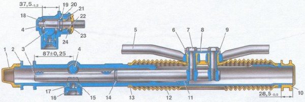 Заниматься ремонтными работами легче, если знать принцип функционирования всех деталей. По своей конструкции рейка предельно проста, в ней содержатся следующие основные элементы: