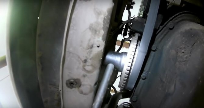 Чтобы отвернуть шкив коленвала сначала его нужно зафиксировать от проворотов — для этого в корпусе сцепления снизу сверлится небольшое отверстие и нарезается резьба под болт 6-го размера.