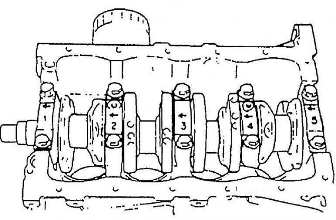 1. На блоке цилиндров: места нанесения меток 1, 2 или 3 2. На коленвале: метки 0, 1 или 2 3. На вкладышах: метки размерной группы (от 1 до 5) |