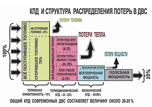 Забегая вперёд можно констатировать, что для бензиновых двигателей КПД равен примерно 25 процентам. Почему так мало, и чем обусловлены такие цифры? Причины здесь в потерях: если взять некое количество топлива, и обозначить его ста процентами чистой энергии, передающейся мотору, то можно проследить все потери.
