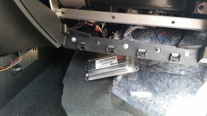 «Мозги» располагаются в нижней части передней панели, а точнее под бардачком. Лучше будет видно, если смотреть с пассажирского сиденья. ЭБУ скрыт шумоизолячией и обивкой, поэтому достать его будет не просто.