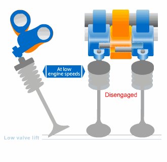На низких оборотах крыло Т-образного рычага двигается без какого-либо воздействия на рокеры; впускные клапана соответственно управляются низко- и среднепрофильными кулачками. При достижении 3500 об/мин поршни в коромыслах сдвигаются гидравликой (давлением масла) так, что Т-образный рычаг начинает давить на оба рокера и оба клапана таким образом управляются высокопрофильным кулачком.
