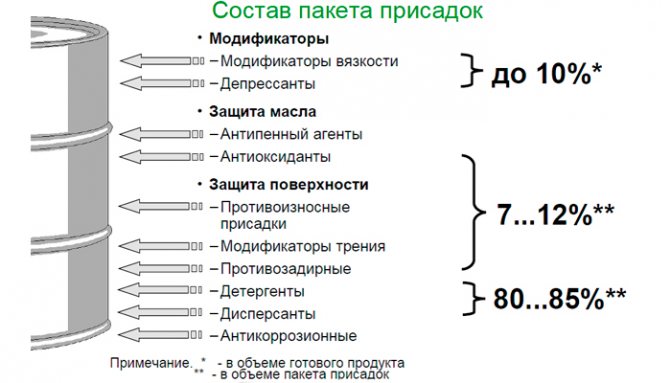 Любое из моторных масел, применяющихся сегодня, состоит из двух компонентов: базового состава и пакета присадок. Они призваны обеспечить антифрикционные, моющие, антиокислительные, антикоррозионные, диспергирующие, вязкостные, а также другие свойства смазочных составов в широком диапазоне температур. От отрицательных в холодном двигателе до высоких в цилиндро-поршневой группе работающего мотора.