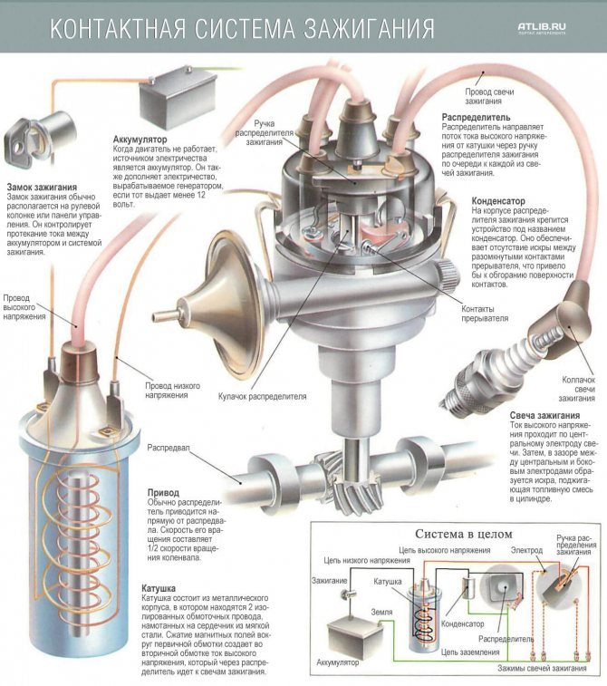 Схема контактной системы зажигания довольно проста и широко применяется на различных автомобилях.