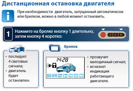 Опция прекращает цикл повтора, если старт двигателя был неудачным. Возможно продление работы мотора на заданное время — на пять, десять, пятнадцать или двадцать минут. Для этого курсором выбирают специальную иконку на дисплее и нажимают на неё. При старте, брелок будет показывать сколько сталось до выключения завода с учётом дополнительных минут.