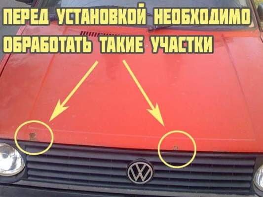 - Двухсторонний скотч оставляет «хороши» следы на том месте капота, где он находился. Его можно содрать, однако при этом легко можно снять и слой краски. Не приятный момент.