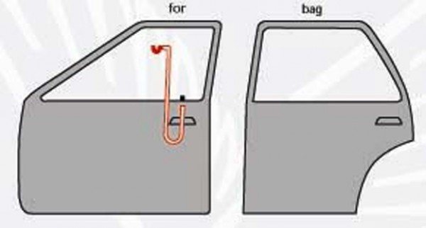Далее нужно аккуратно подкачать воздух, чтобы дверь достаточно приоткрылась и появилась возможность просунуть в салон жесткую проволоку. Концом свернутым крюком нужно зацепить за ручку и потянуть для открытия двери.