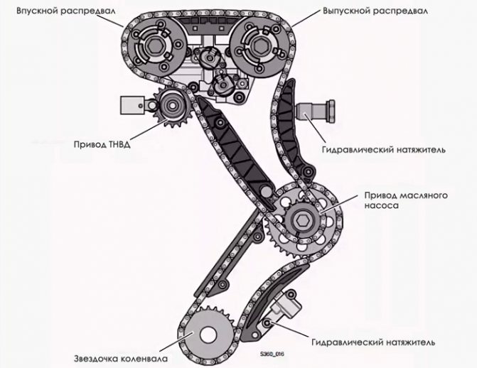 Для привода ГРМ используется цепь. Нижняя цепь соединяет коленвал и двойную звездочку. От двойной звездочки с помощью цепи приводятся в движение оба распределительных вала. Цепи имеют натяжители.