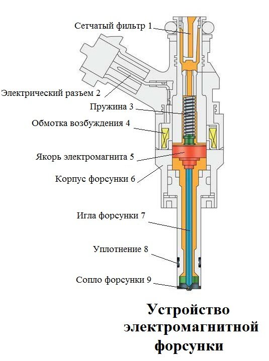 1 — сетчатый фильтр; 2 — электрический разъем; 3 – пружина; 4 — обмотка возбуждения; 5 — якорь электромагнита; 6 — корпус форсунки; 7 — игла форсунки; 8 – уплотнение; 9 — сопло форсунки.
