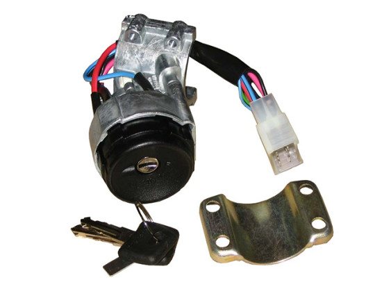 Совместно с поворотом ключа личинка запускает вал контактной группы. В зависимости от выбранной позиции напряжение подается различным потребителям – электрическому оборудованию, системе зажигания и стартеру. Запорный стержень заблокирует переднее колесо только в положении Lock. В этом же положении ключ достается из зажигания.
