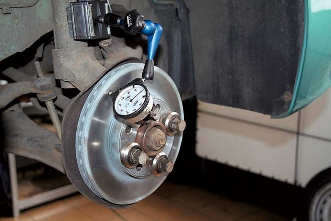 - После этого при помощи инструментов делается замер примерной кривизны полотна диска, чтобы определить, насколько требуется сточить металл с детали;
