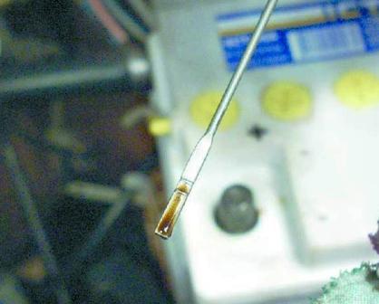 - затем вставляем щуп обратно до упора и вытаскиваем его. Уровень трансмиссионной жидкости должен находиться где-то посредине между о и «Max»;