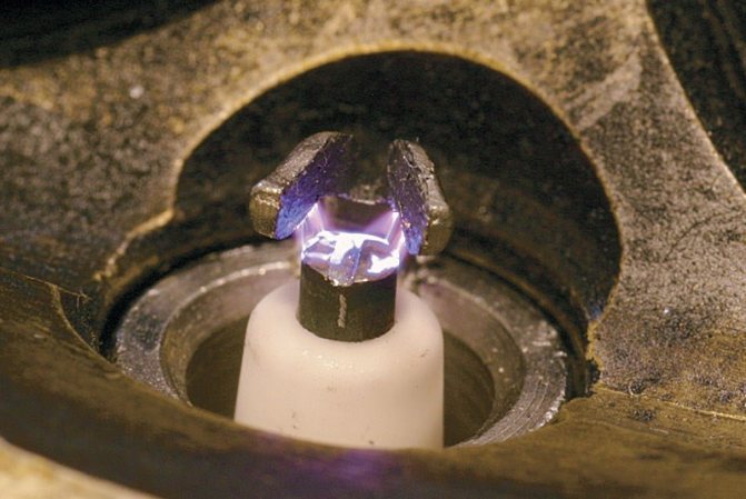 В результате замыкания на свечах достигается напряжение 10–15 кВ. Этого достаточно, чтобы между центральным и боковым электродом свечи возникла искра.