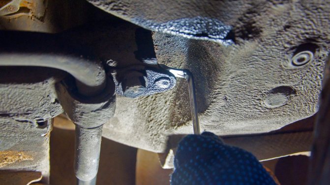 Как это обычно происходит с резьбовыми соединениями внизу машины, они все давно покрылись слоем грязи и закисли. Поэтому перед началом работы есть смысл полить болты WD40. Чуть-чуть ждём и вытаскиваем на свет тот самый ключ с переломанной судьбой и пытаемся открутить болт на десять сверху (видно на фото).