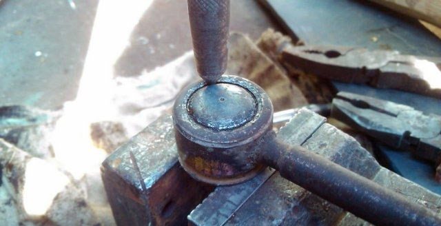 - Сжать шарнир в тисках в направлении, которое показано на фото.