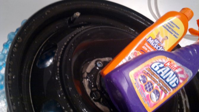 - Теперь диски необходимо тщательно очистить от грязи, пыли и следов битума. Для этого подойдет автомобильный шампунь или другое бытовое моющее средство.