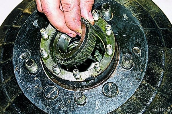 Извлекаются внешние кольца при помощи бородка. Под ними есть регулировочное кольцо. Перед тем как провести их сжимание, необходимо подготовить новые экземпляры деталей. Если требуется, меняется шестерёнка, отвечающая за спидометр. Дифференциал после смены подшипника вновь собирается.