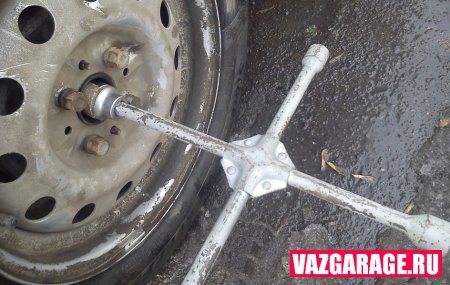 - Начать необходимо с откручивания гайки ШРУС-а, автомобиль должен быть установлен на горизонтальной плоскости с немного вывернутым в сторону рулем. Ключом откручиваем гайку гранаты против часовой стрелки.