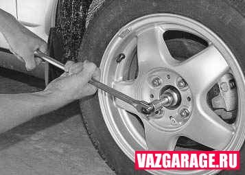 Начать нужно с того, что необходимо поддамкратить переднее колесо автомобиля, снять колесо. Дальше снимаем колпачек и откручиваем гайку ключом. Здесь без помощника не обойтись, гайка сильно затянута, нужно, чтобы один откручивал, а в второй — помощник — нажимал на педаль тормоза в это время. После снимаем суппорт, для этого откручиваем 2 болта ключом на «17», затем диск, также 2 болта уже ключом на «19»